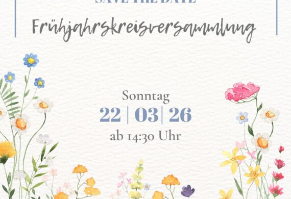 Am 22.03.2026 um 14:30 Uhr findet die diesjährige Frühjahrskreisversammlung statt. Eine offizielle Einladung folgt zu gegebener Zeit.